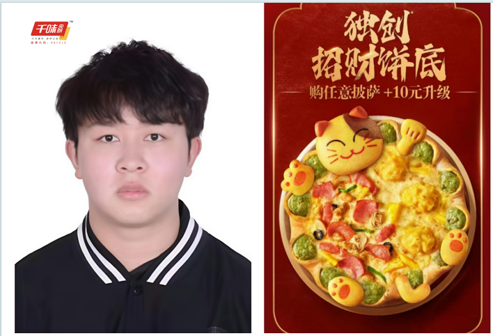 图1.中西面点专业的葛嘉艺同学和其为必胜客设计开发的“招财猫”披萨