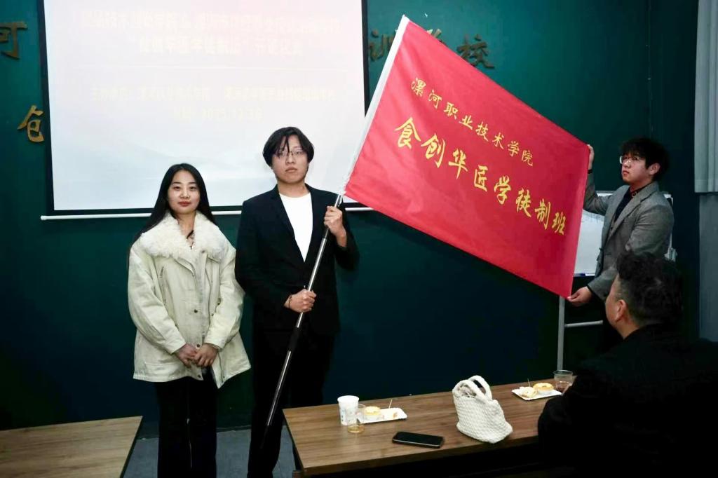 仪式上,陈冰为漯河市华匠技术顾问王冬菊颁发企业导师聘书,李琳为学徒制班授“食创华匠学徒制班”班旗。