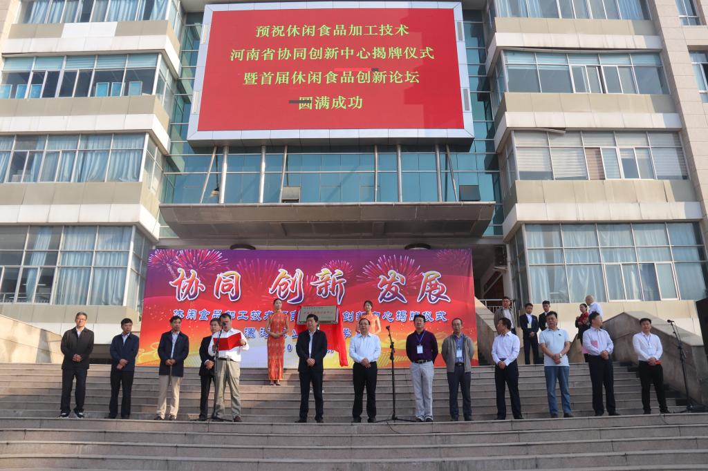 9月28日上午,“休闲食品加工技术河南省协同创新中心”揭牌仪式在公司实训广场举行。漯河市政府副市长栗社臣、公司党委书记顾文明共同为休闲食品加工技术河南省协同创新中心揭牌。河南工业大学粮油食品公司经理王晓曦教授,南京农业大学食品科技公司博士生导师、国家禽肉加工技术研发中心主任黄明教授,临颍县产业集聚区管委会副主任卢庆恩,漯河市平平食品有限责任公司副总经理、研发总监刘忠思出席会议并发言。河南科技公司、河南省农产品加工与贮藏工程学会、食品科技学会理事高晗教授以及市科技局、市科协、市食品工业办公室、市食品药品监督管理局相关领导以及“中心”理事会成员单位各位理事、企业界代表和师生代表参会。董事长王春阳主持会议。