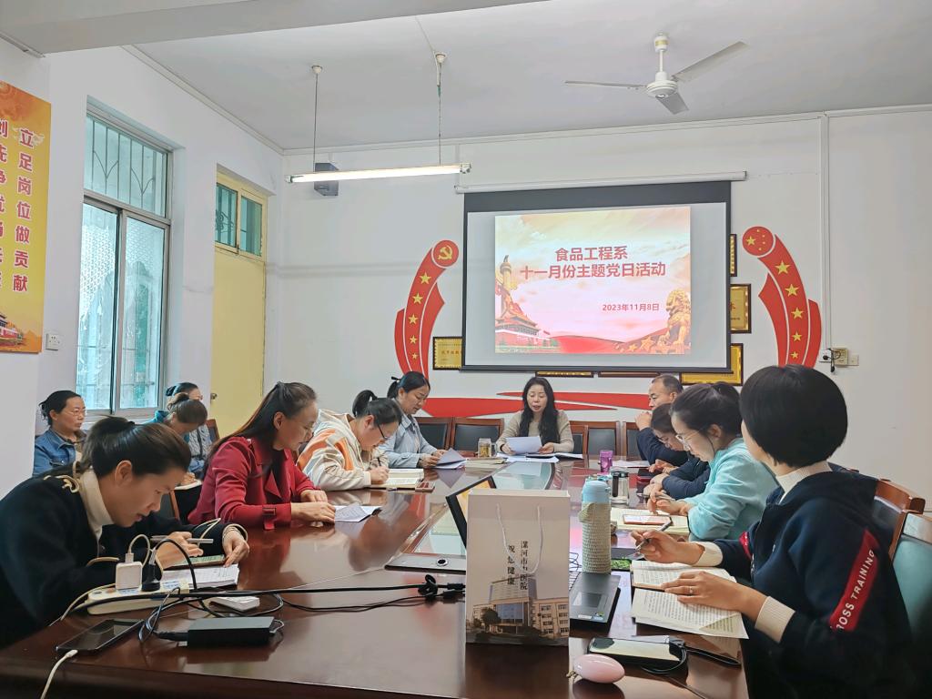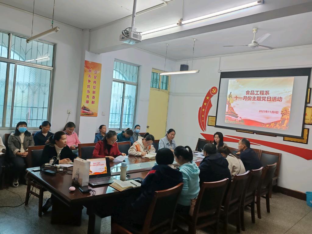 为全面学习贯彻落实党的二十大精神,把习近平新时代中国特色社会主义思想转化为坚定理想、锤炼党性和指导实践、推动工作的强大力量,11月8日,食品工程系教工党支部在系党建活动室开展11月份主题党日活动,本次活动由党总支负责人王新娜主持,并对此次活动进行总结,全体党员教师参会。