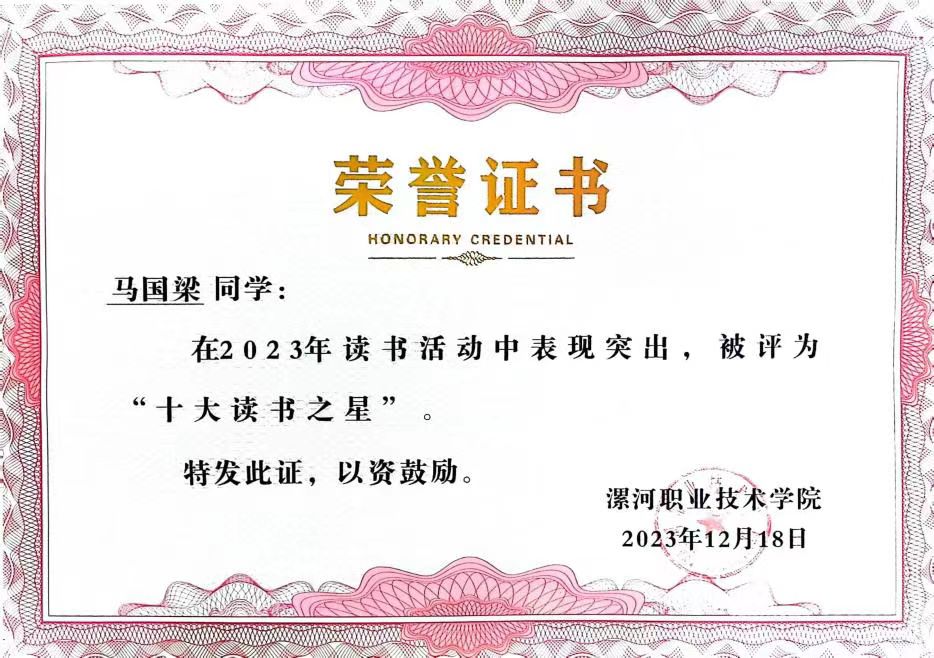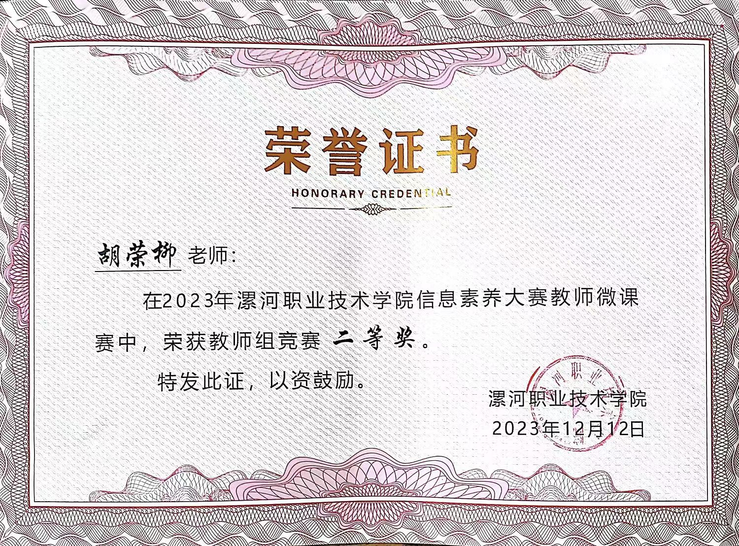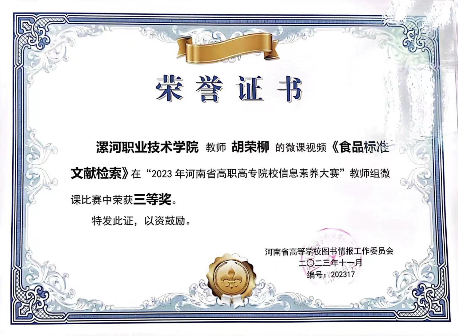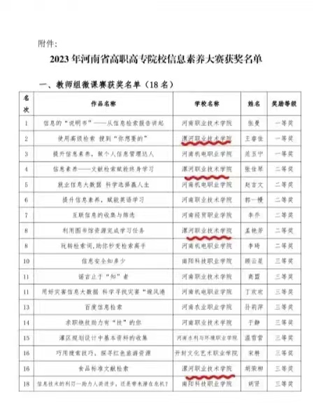 近日,2023年河南省高职高专院校信息素养大赛成绩揭晓。此次大赛中,全省教师组微课赛共计获奖18名,我系教师胡荣柳荣获三等奖,并在太阳集团tyc1512023年信息素养大赛中荣获二等奖。我系员工马国梁在校园读书之星活动中荣获全校十大读书之星。