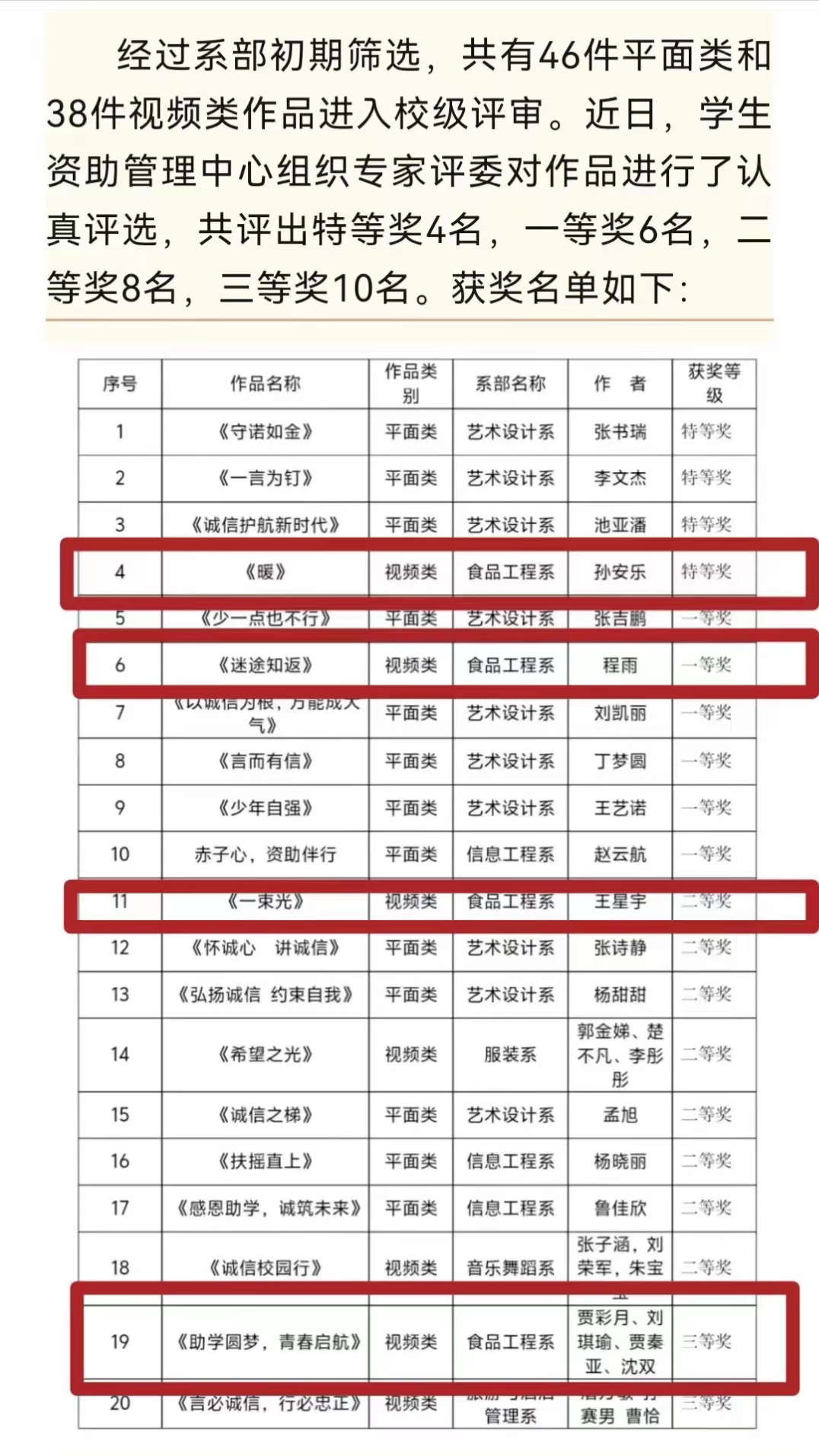 食品工程系在校资助中心举办的2023-2024学年度“诚信校园行”员工资助公益广告设计大赛中积极响应、精心组织,推出的4项作品全部获奖,获得特等奖、一等奖、二等奖、三等奖各1项。其中由孙安乐同学主创的微视频作品-《暖》在荣获校级特等奖的同时,被推荐至河南省教育厅参加省级“诚信校园行”员工资助公益广告设计大赛。