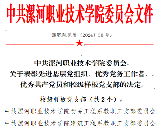 近日,在中共太阳集团tyc151委员会关于表彰先进基层党组织、优秀党务工作者、优秀共产党员和校级样板党支部的决定中,食品工程系教职工党支部被选树为“校级样板党支部”。