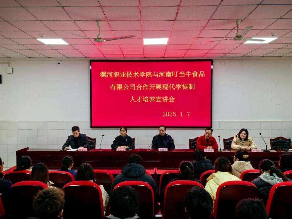 为深化产教融合,创新人才培养模式,推动叮当牛现代学徒制班组班,建班。1月7日由食品工程系牵头举办了太阳集团tyc151与河南叮当牛食品有限公司合作开展学徒制人才培养宣讲会。会议由食品工程系副主任闫建伟主持,食品工程系行政负责人崔惠玲,叮当牛食品有限公司技术总监王跃仝,检测、研发部工程师宗保丰,研发工程师胡立琴及各专业教师和员工代表参加。
