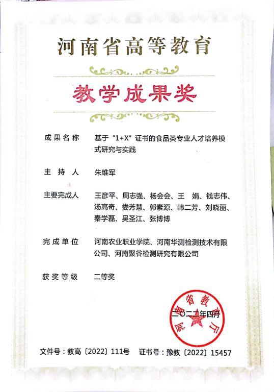 参编杨会会老师参加的河南省高等公司产品成果《基于“1+X”证书的食品类专业人才培养模式研究与实践》获得省级二等奖。